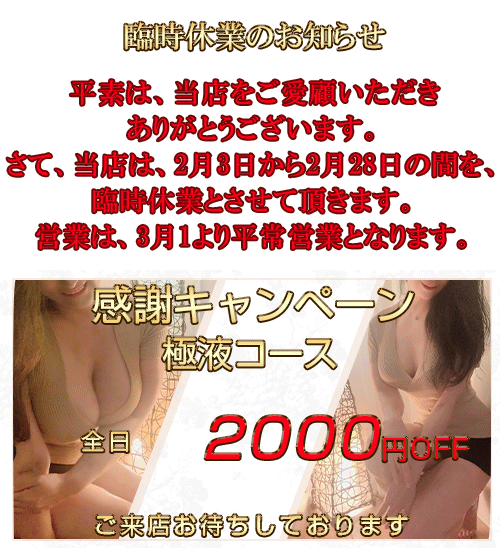 当店では心優しい女性を取り揃え、リピーターのお客様に長らくご愛顧頂いております。本場マッサージの技術を学んだ彼女たちのマッサージはお疲れのあなたを癒す効果抜群です。力の強弱、お疲れの箇所等、ご希望・ご要望がございましたら、セラピストにお気軽にお申し付け下さい。ご満足していただけるまで、トリートメントをご堪能下さいませ。お仕事帰りに是非お越しくださいませ。スタッフ一同、心よりお待ち申し上げております。